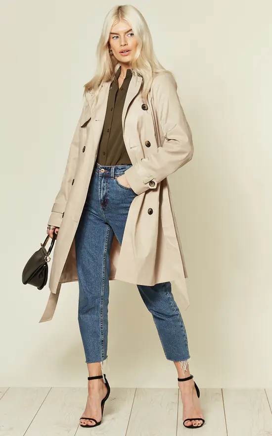 Beige Belted Double Breasted Trench Coat.It Is A Slim Fit Raincoat With A Vent In The Back And A Storm Flap.
