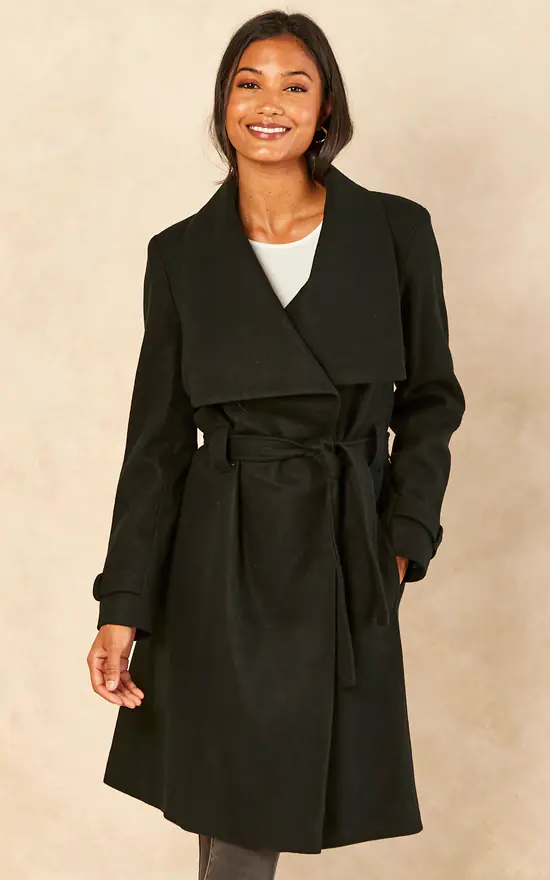 This is the must have coat of the season. It is stylish and has all the hallmarks of a classic fashions coat. It features a large Collar, multi stitched tie belt and 2 pockets. There is a hidden Popper fastening. Black