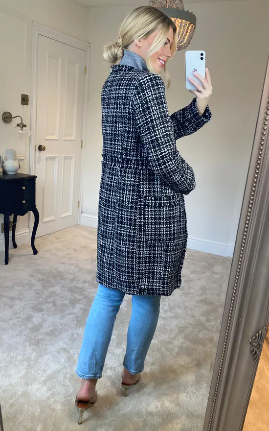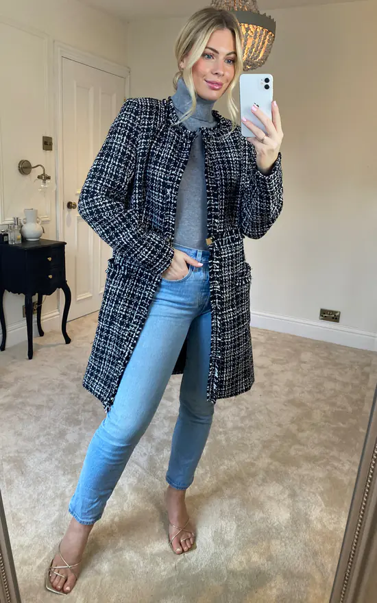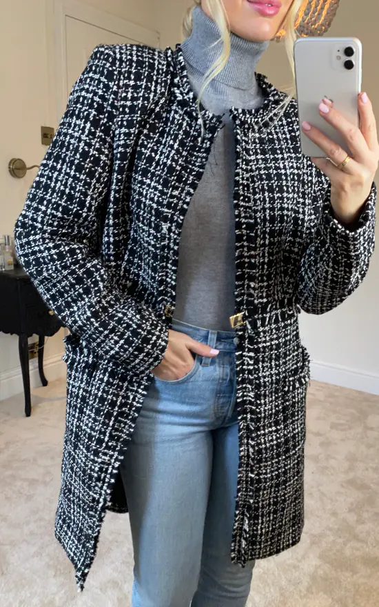 Get The Latest Anastasia Fashions Women’s Coat. This Coat Is Styled In Boucle Tweed With Frayed Edge Detail.It Has 2 Pockets And A Metal Buckel And Is Fully Lined