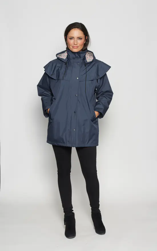 On Trend – This waterproof storm wear style riding jacket is popular for dog walking and an outdoor countryside lifestyle where protection from the elements is essential. It has knitted cuffs with storm flaps and detachable hood (attached by poppers), the hood has a toggle cord and is check lined. The coat has a zip and popper front and does right up to the neck. It has taped seams which are completely waterproof. Navy