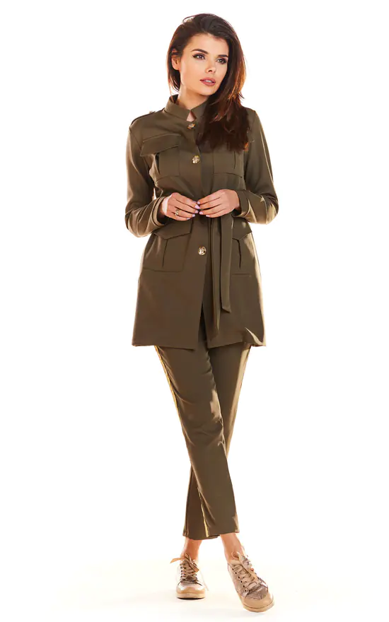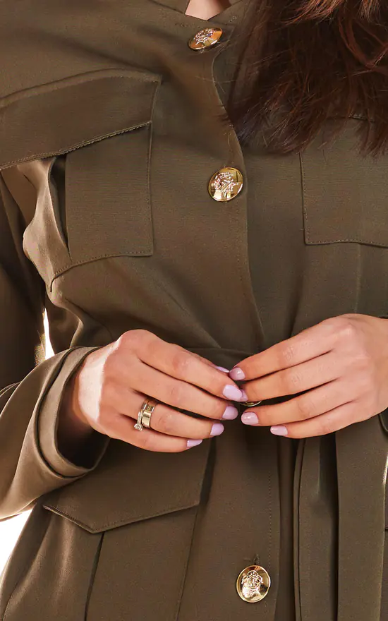Big pockets, gold buttons and a light stand-up collar add character to the design, and the waistband will emphasize all the strengths of the silhouette.