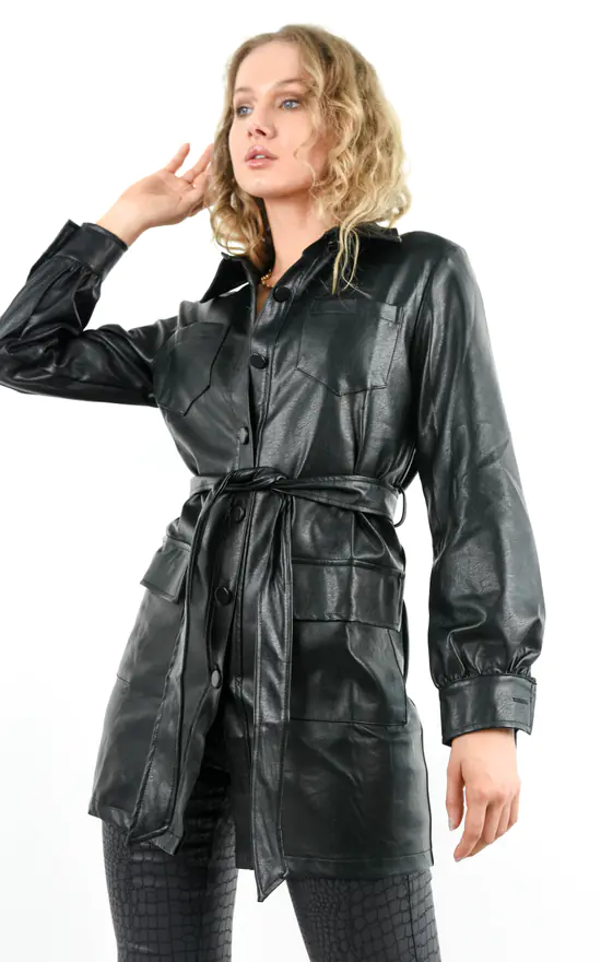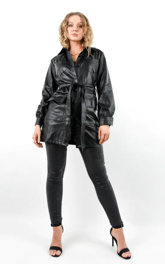 High-quality Black faux leather long length jacket. A comfortable thin coat style jacket perfect for the autumn/winter season.