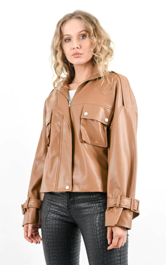 High-quality Camel faux leather long sleeve jacket. A comfortable style jacket perfect for the autumn/winter season.