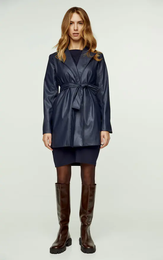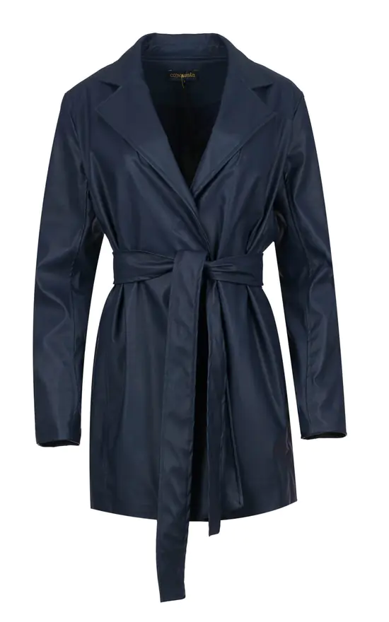 This navy buttonless jacket is crafted in faux leather. It has long sleeves, a collar and lapel. There is a 5.5cm wide belt in the same fabric. The garment is fully lined with a blue lining. This jacket has a loose straight silhouette.