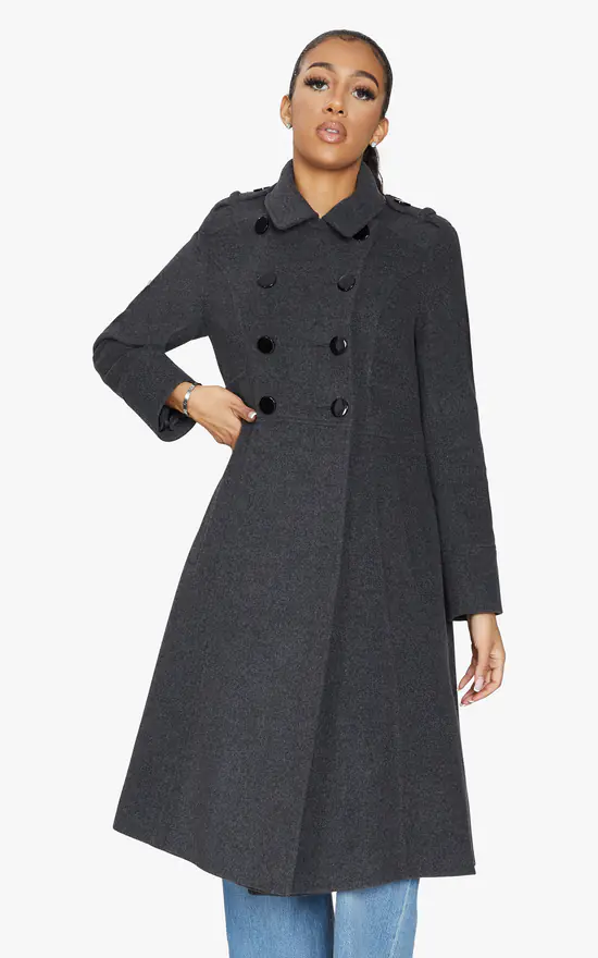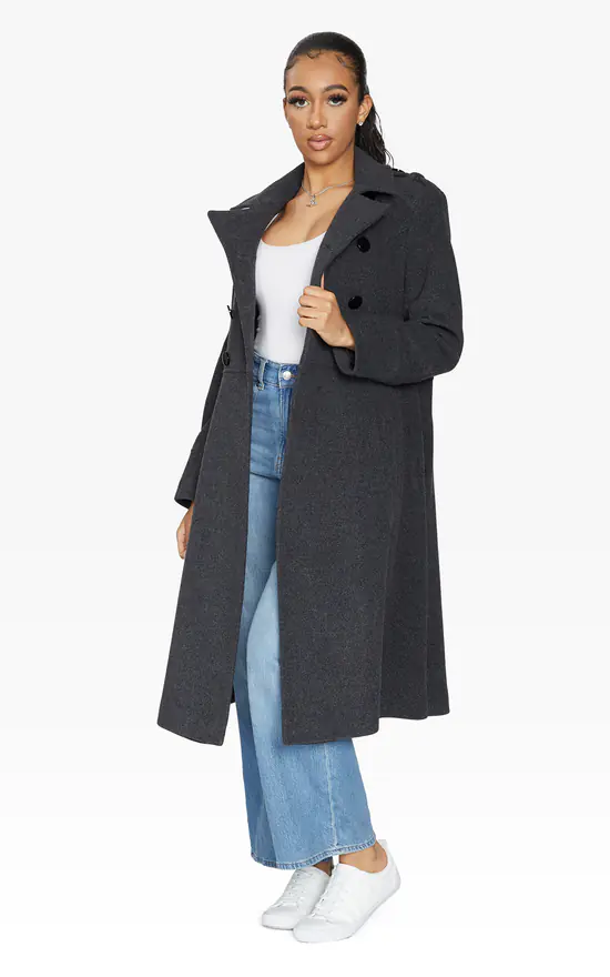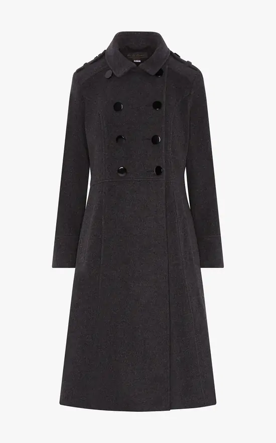 De La Creme Fashions Present the A-Line Double Breasted Coat in Grey. Featuring double breasted design, a-line fitting and rear half belt to finish. Fully lined inside. Crafted using Italian wool and cashmere blend fabric. Made in London, England using domestic and imported materials.