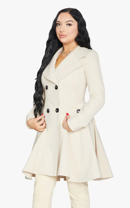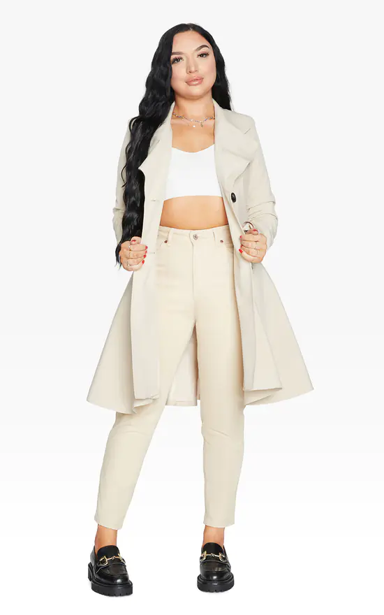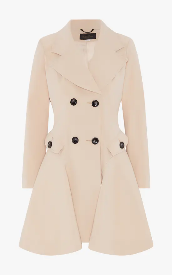 A spring/summer staple outerwear piece. Designed from a lightweight polyester mix fabric, this coat boasts an A-line slim fitting. Featuring double breasted fastening and lace trim on the rear for extra fitting, this coat is sure to flatter every figure. Comes in sizes UK 8 – 20 and in many beautiful colours also. This colour available is Stone