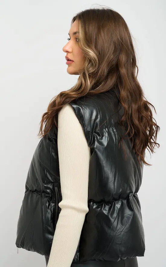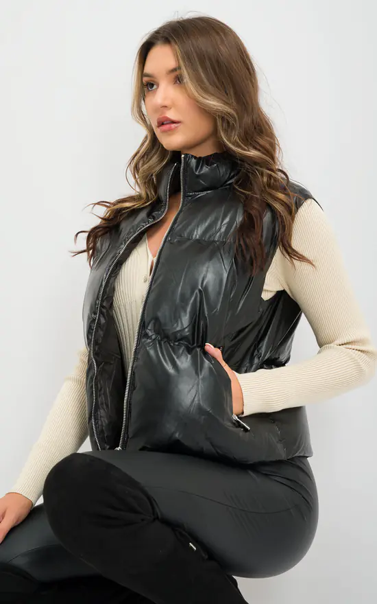 Get your new season look on point with this Faux Leather Padded Gilet. Style this gilet over one of our comfy Lounge Sets & chunky boots to complete the look.