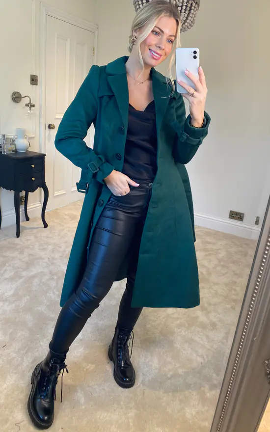 Introducing our Maisie Swing Coat in a beautiful emerald green colour. The chic lapel collar gives structure to this piece, making it a sophisticated style to wear this autumn/winter. Adding to this structured look are the buttoned panels at the front and back bodice, sitting neatly behind the lapel collar. The single breasted front buttons lead down to the swing skirt which is belted at the waist and has hidden and handy side seam pockets. Designed with care, this piece is a must have this winter, designed with a modern twist on the 1950s classics, this style is perfect for a vintage lovers wardrobe. Rich in colour and comfortable to wear, make this style your go to piece this season!