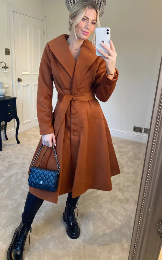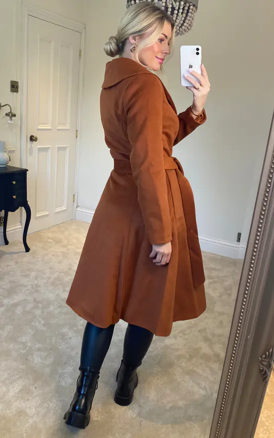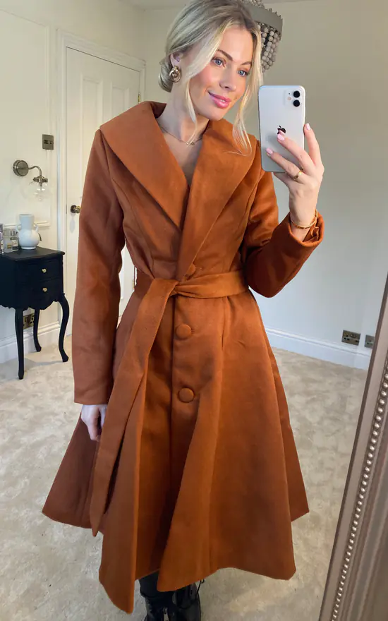 Welcoming our brand new Samara Swing Coat into our autumn/winter collection. This beautiful golden brown colour will give a much desired richness to your winter wardrobe. The shawl collar is wide along the neckline, giving a cosy feel to this piece. The bodice is fitted leading down to a flowing skirt with concealed side seam pockets. The coat is fastened with a single row of buttons and a tie belt in self-fabric, which can be tied into a lovely front bow. Cosy and warm, this style is easy to wear all winter long!