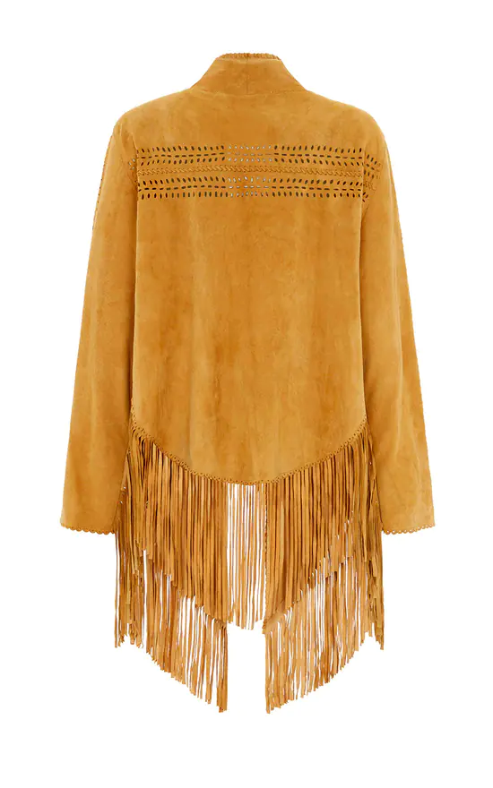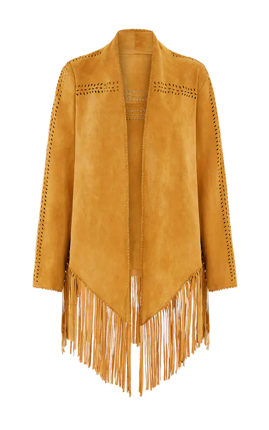 A nod to the stylish 70s. Crafted in the softest lambs leather, this suede jacket with fringed edge and sleeves is 100% handmade. It also features a unique cut-out pattern and scalloped detail. Western chic has never looked as good.