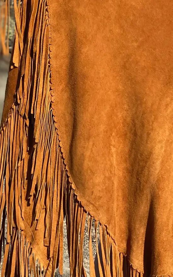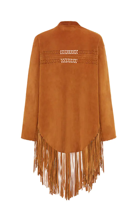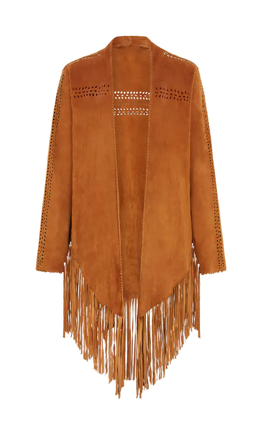 A nod to the stylish 70s. Crafted in the softest lambs leather, this suede jacket with fringed edge and sleeves is 100% handmade. It also features a unique cut-out pattern and scalloped detail. Western chic has never looked as good.