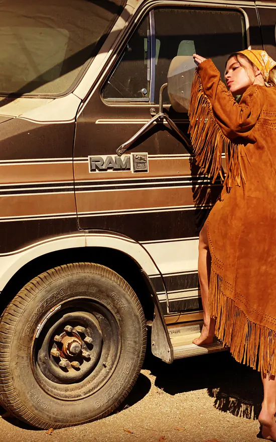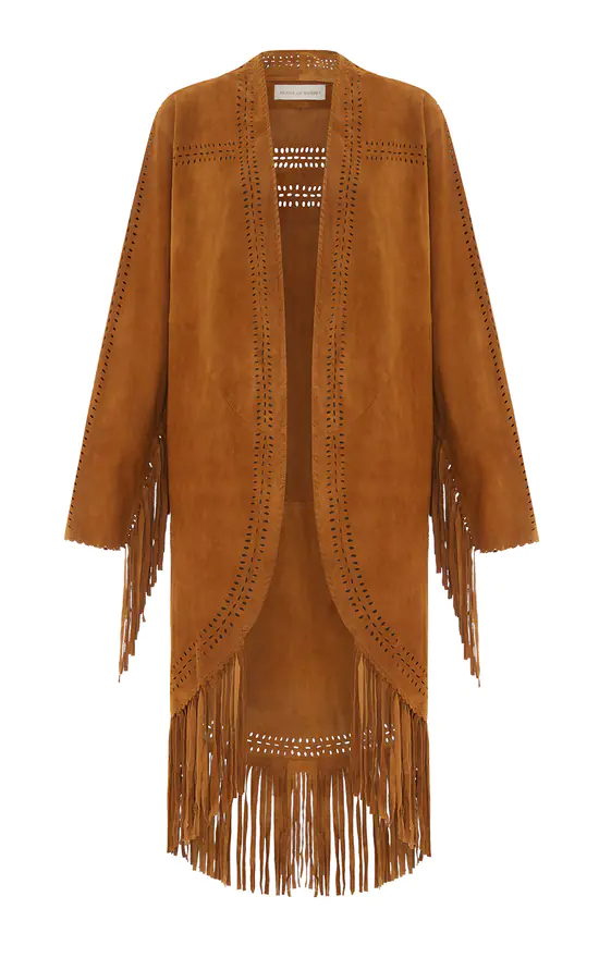 A nod to the stylish 70s. Crafted in the softest leather, this stunning long suede jacket with fringed edge and sleeves is 100% handmade. It also features a unique cut-out pattern and scalloped detail. Dressed up or down, Western chic has never looked as good.