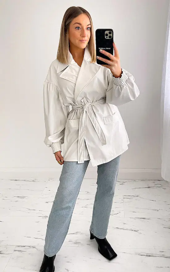 If you’re looking for a jacket with a touch of luxury, this one’s perfect. Made from faux leather, it features a belt waist and cuffed sleeves for a stylish look. The collar structure also adds to the elegance of this jacket.