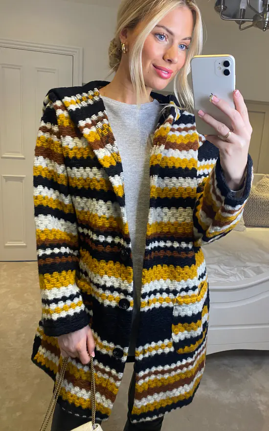 Make a statement in this striped hooded duster coat. With a button front, long sleeves, pockets, a hood and an oversized longline fit. Layer over a long sleeve top, jeans and trainers for a dressed down daytime outfit.