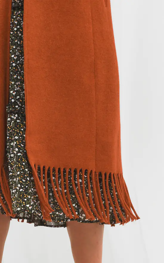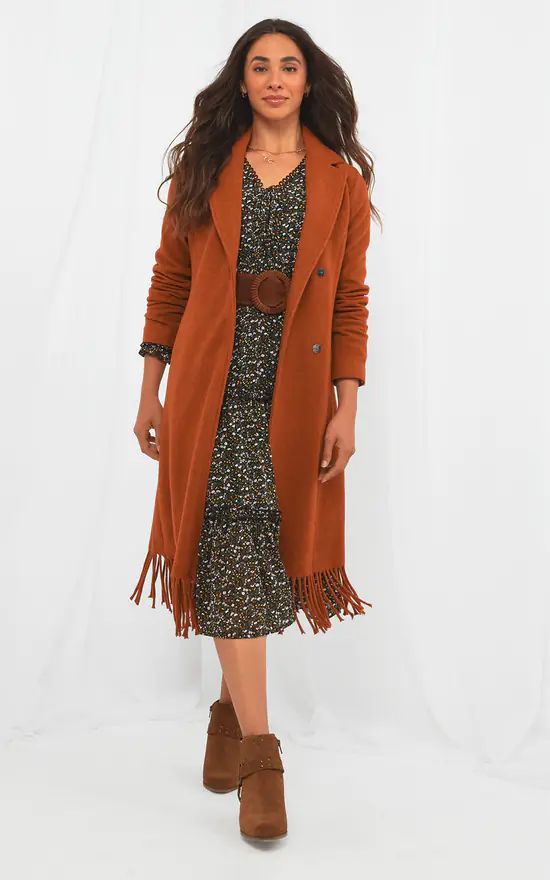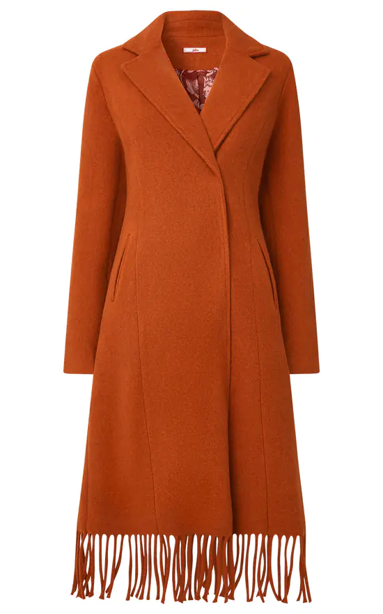 Simple yet stunning, this fringed coat is a real staple for your winter style. We love the contrast between the plain bodice and fringed hem – it creates such a clean look while still having that all-important pop of personality. Just choose your favourite colour – black or burnt orange – and wear it your way to create a truly unique look with a soft wool blend handfeel