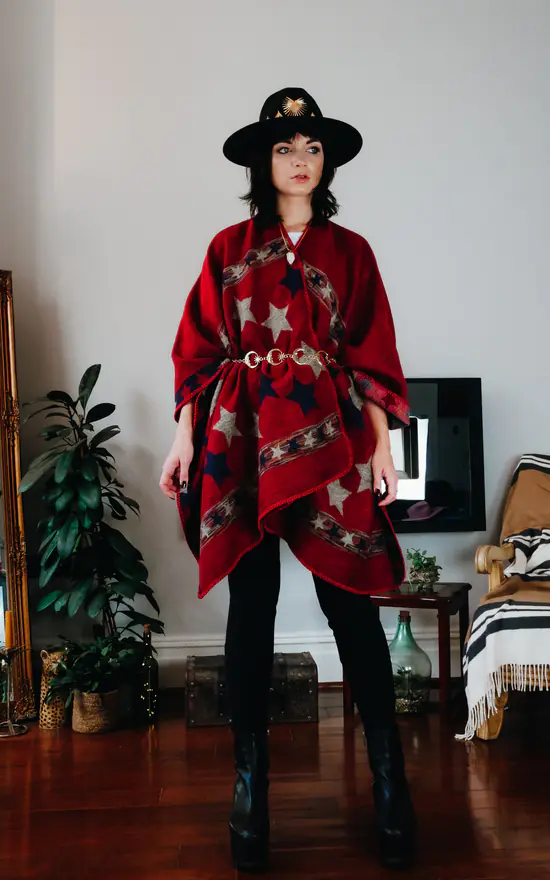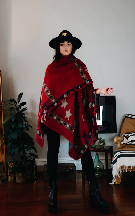 Red and grey shawl pashmina. From our Moon Coven collection. This long shawl can be worn on the main red coloured side or the grey. Made in a celestial star design, this super versatile piece sits as a shawl over jeans and can be synched in at the waist using a belt as shown to create a cardigan kimono style, or thrown over the shoulder. Super soft and warm, makes a perfect addition to an Autumn winter wardrobe and a great gift.