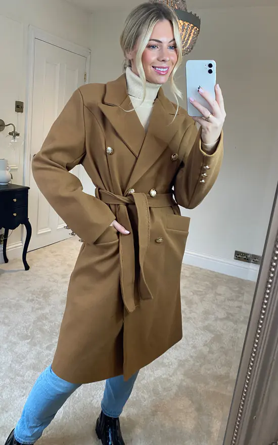 Our trendy new trench coat can be worn all year round. A timeless piece which is the perfect finish to any outfit. Features front gold button fastening, 2 side pockets, belt fastening and long sleeves with 3 gold buttons. Layer with our polo necks, fine knits and jeans or leggings.
