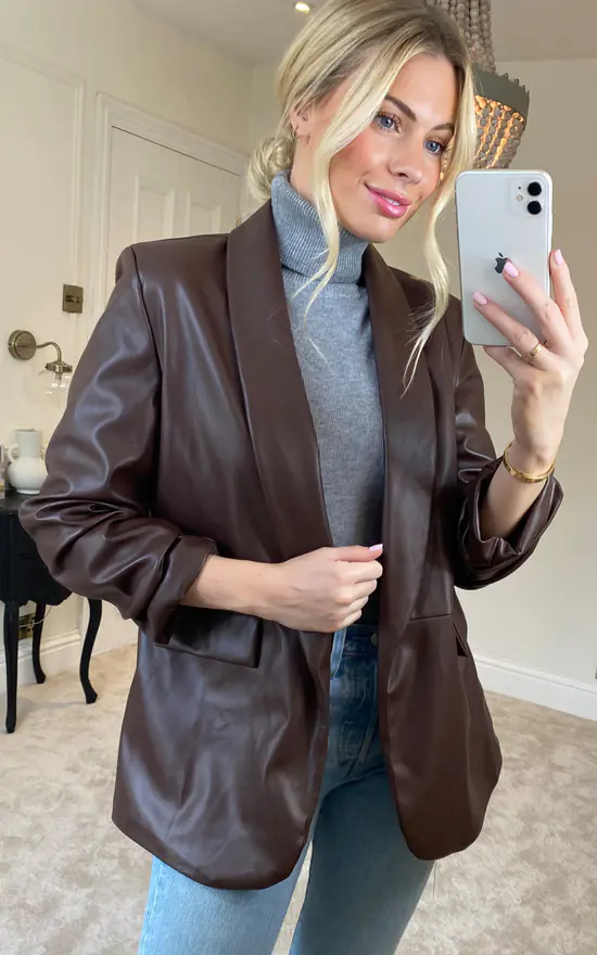 Our best selling blazer now in faux leather. Luxury and stylish! Features long rouched sleeves, faux pockets and lapel collars. Fully lined for comfort and a flattering fit. Worn open for a smart and trendy look. Team with jeans and trainers or leggings and heels. Can be worn day to night.