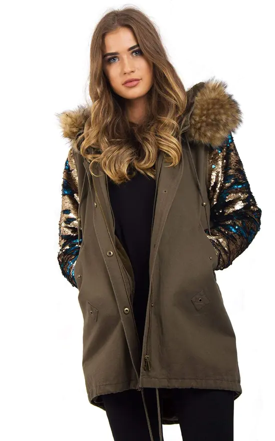 Two sided colour sequin sleeves in Khaki green