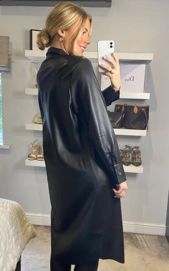 For a trending Autumn look, style this sleek, faux leather piece in your own way. Wear fastened up as a stunning dress or opened fully as a jacket. The versatility can take you from dusk to dawn easily and will look fabulous for any occasion from casual weekends to nights out on the town. This unique jacket/dress has been designed with a relaxed collar and popper button fastening to the front and on the cuffs and crafted from the most ultra smooth soft pu fabric.