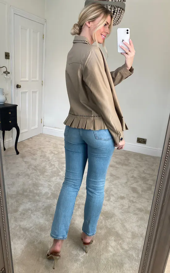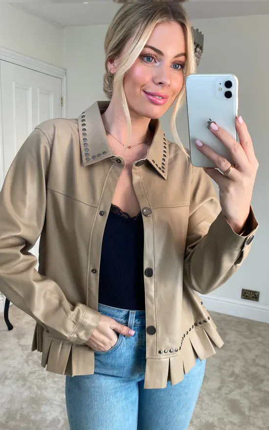 This beautiful pu jacket is the perfect piece to throw over any outfit for a final finishing touch! The cute frill hemline gives this jacket a touch of feminine personality, whilst the stud detail adds a tiny bit of rock chic character. Press stud fastening for ease and crafted from a super soft imitation leather fabric. One size will fit from a 10-16.
