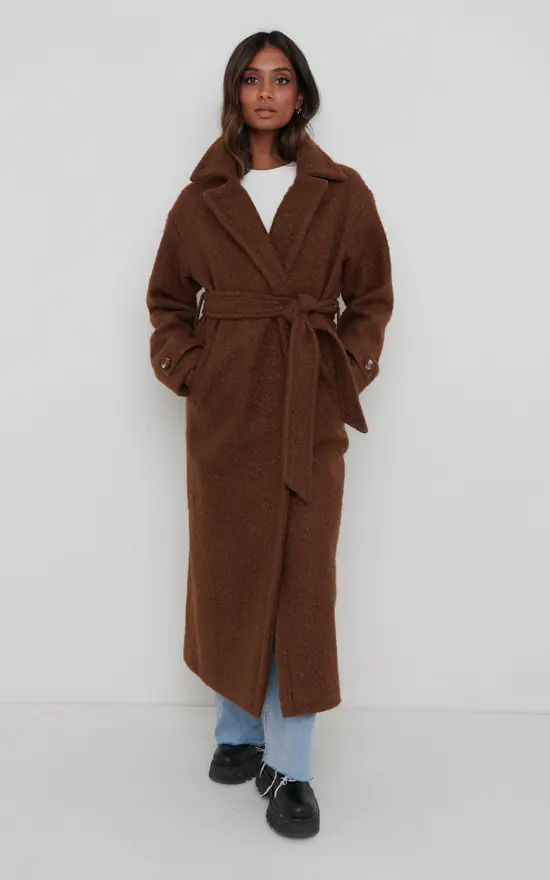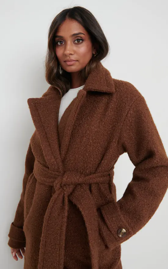 Featured from our Maximal Minimalism September October collection. Choose from 4 stunning neutral pantones in our Grayson Boucle coat. Designed with an oversized wrap and wide lapels, this is the perfect option to throw on to elevate any winter look. It is crafted from a heavy weight- Brown boucle yarn, creating a textured look and hand feel.