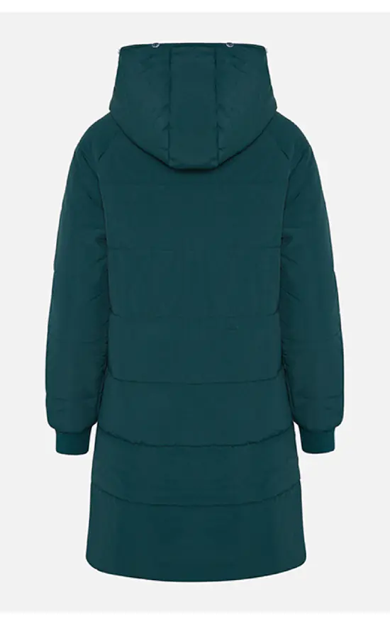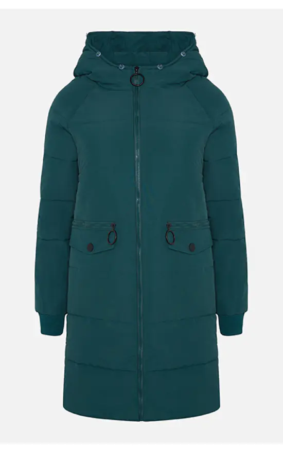 Long jade puffa coat with zip feature on pockets ribbed jersey cuff.